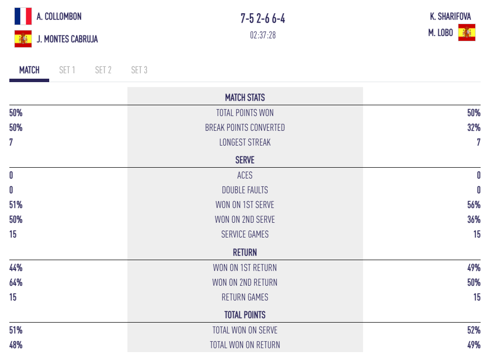 The two teams delivered a high-level duel: that many points earned (50% each)But there was a difference in the key moments. Collombon and Montes knew how to convert 50% of their break points, against only 32% for their opponents.