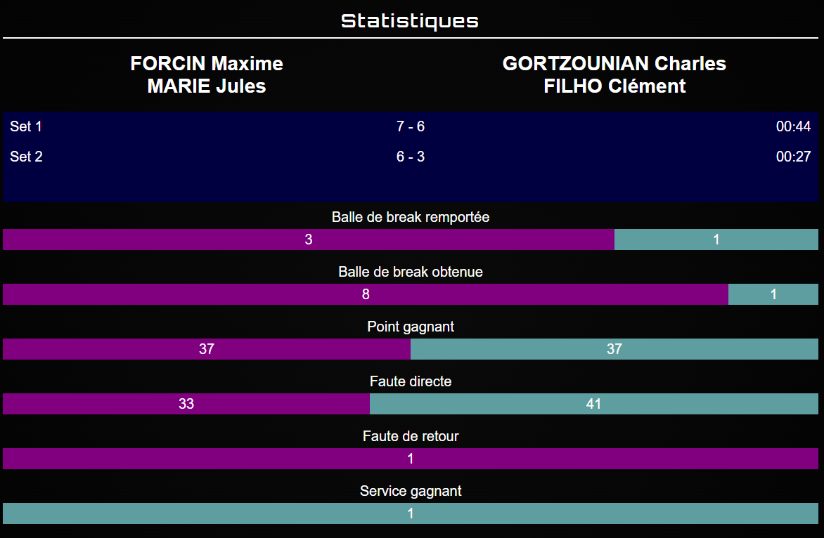 The first set, which was very closely contested, was decided by a tie-break narrowly won by the pair Marie / Forcin, before they unfold in the second. Maxime ForcinImpressively consistent, he perfectly supported Jules Mary, which will aim for a first title in P1000.