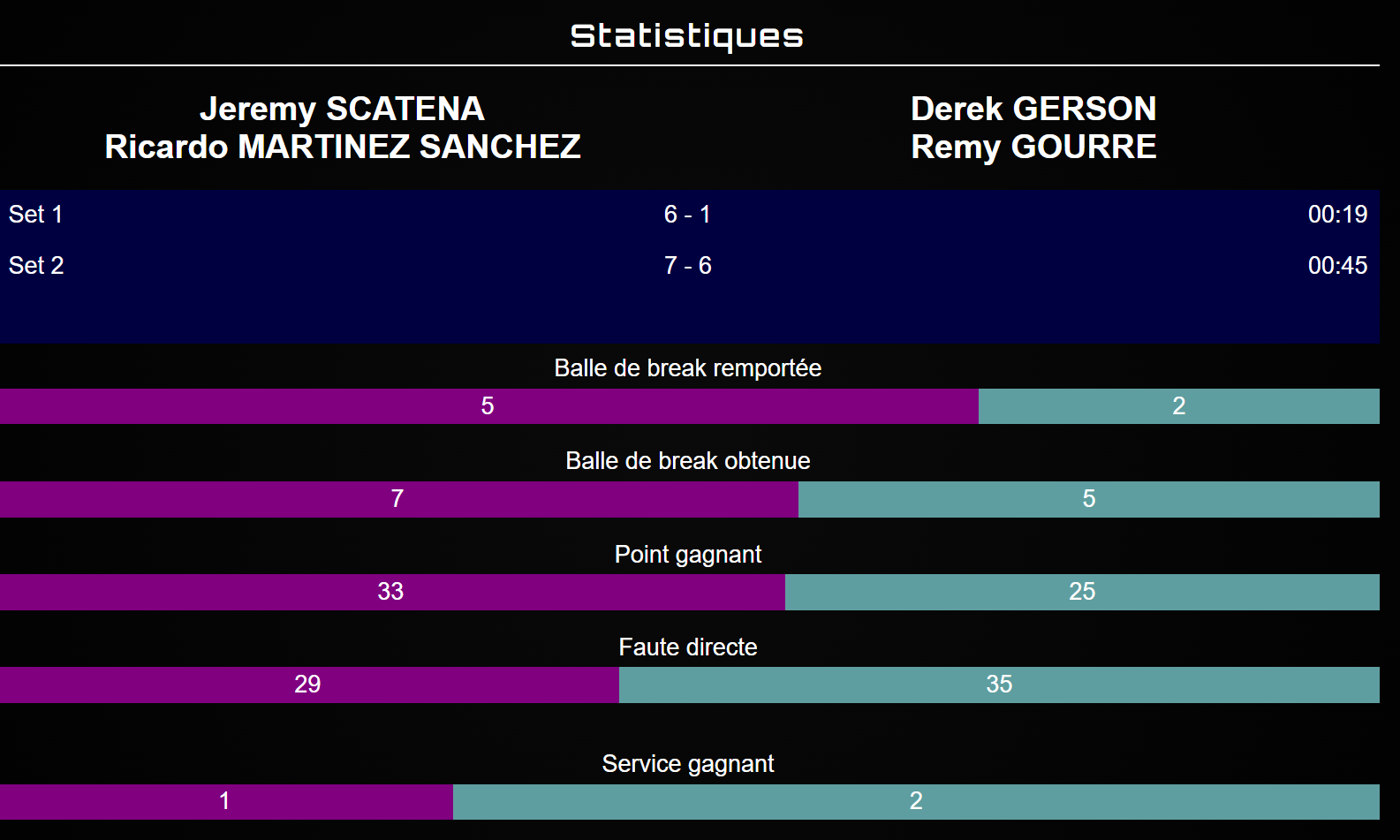 Breaks and re-breaks on both sides, tension and some big points, including a match point saved at 5/4 by Gerson/Gourre on a point of view of "mutant."